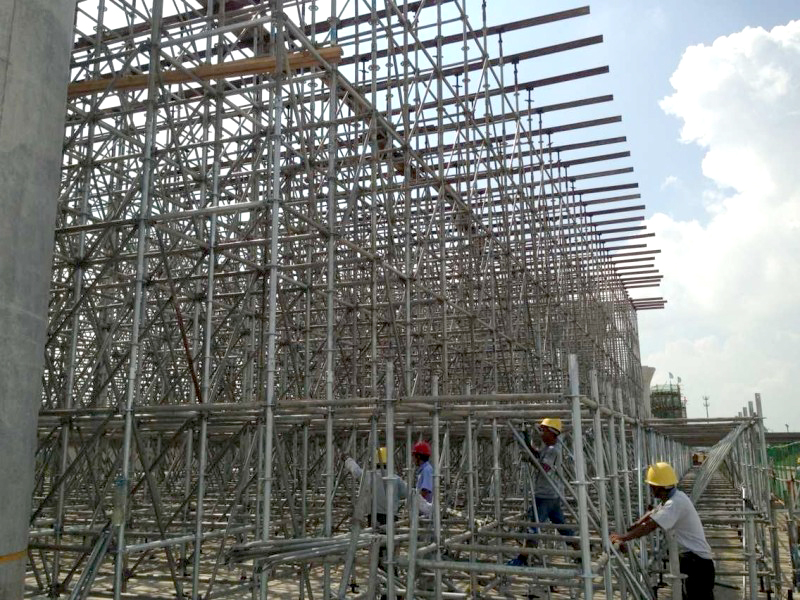在如今的建筑行業(yè)中,經(jīng)常可以看到施工工地有承插型盤扣式腳手架的存在。這種新型承插型盤扣式腳手架便于應(yīng)用在工業(yè)當中,提升施工效率。此裝備是采用每個承載管的搭接,并且兩段有卡入式的接口,使得盤扣式腳手架的橫桿和斜拉桿的端口進行插入搭接。參照幾何穩(wěn)定性的原理,而且立桿,橫桿和底座等都可以進行自主的搭接。為什么這兩年盤扣式腳手架可以迅速的推進到可以應(yīng)用的工業(yè)當中,是因為它本身存在著許多的優(yōu)勢。